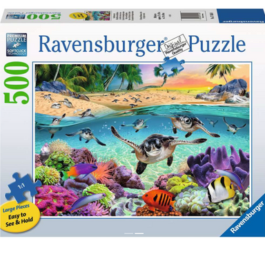Glide through crystal-clear waters with ancient sea turtles past colorful coral and fantastic fish in our “Tropical Waters” puzzle!Ravensburger has...